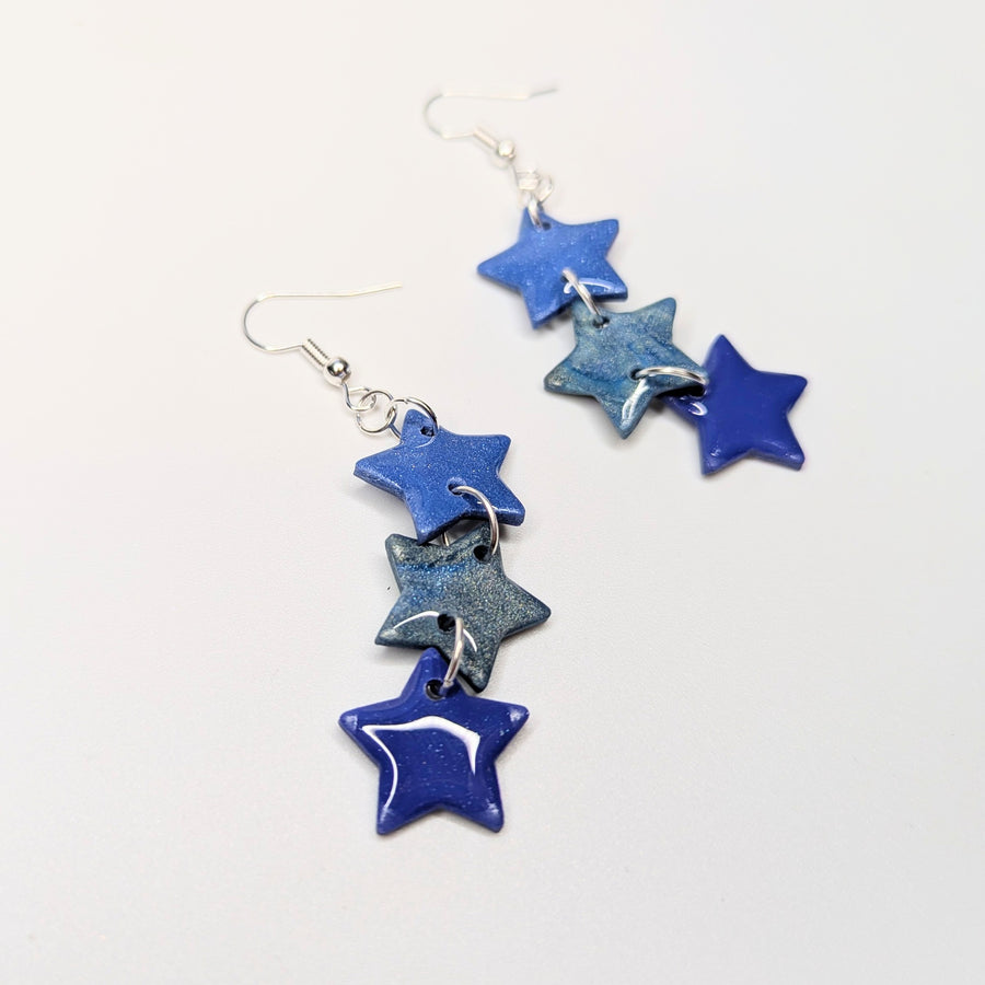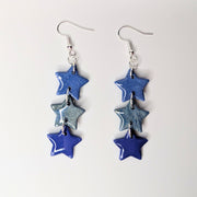 Get ready to dazzle with these Sparkly Triple Blue Star Trapeze Earrings. These earrings are sure to make you shine with their sparkles and unique design. Make a statement and add some fun to any outfit with these quirky and playful earrings. You'll be the star of the show! (Get it? Star earrings?)