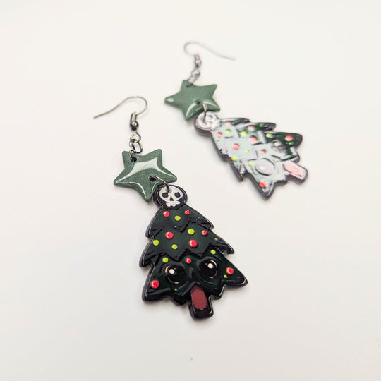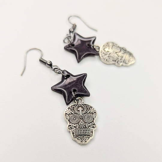 Sparkly Dark Purple Star Topped Candy Skull Charm Trapeze Earrings