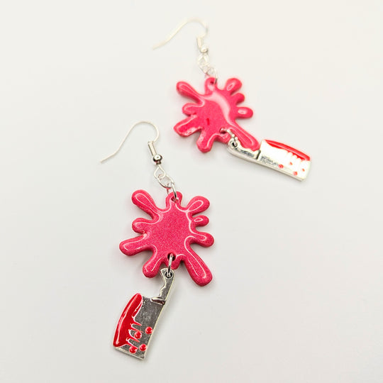 Sparkly Red Blood Splatter Topped Candy Cleaver Charm Trapeze Earrings