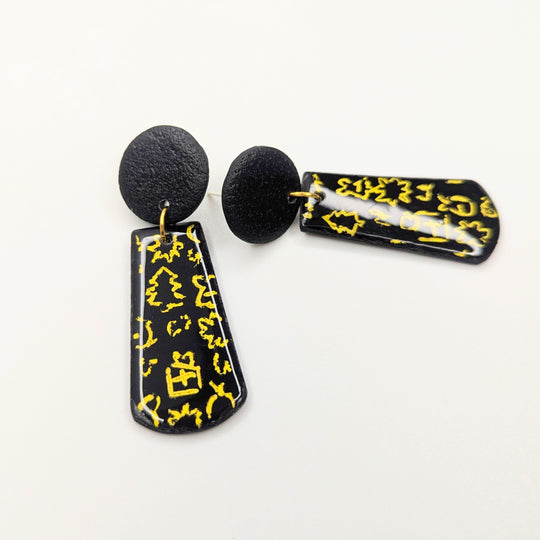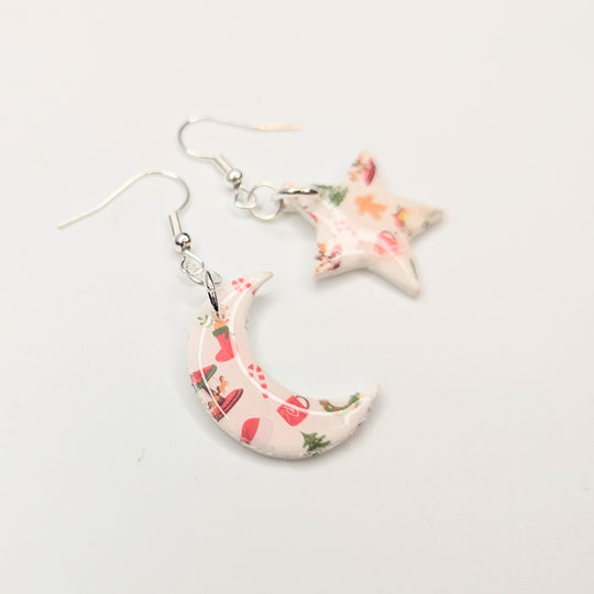 White Christmas Print Star & Moon Huggie Hoop Earrings