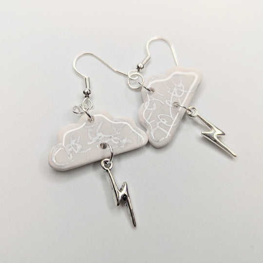 Silver & White Cloud & Lightning Bolt Trapeze Earrings