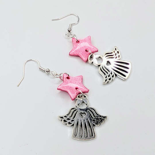 Sparkly Pink Star & Angel Charm Trapeze Earrings