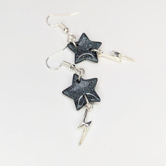 Sparkly Black Star with Lightning Bolt Charm Trapeze Earrings