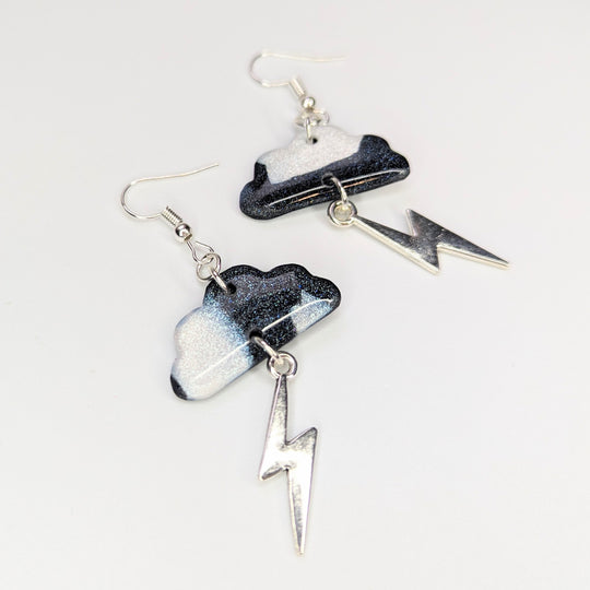 Sparkly Marbled Black & White Cloud & Lightning Bolt Charm Trapeze Earrings