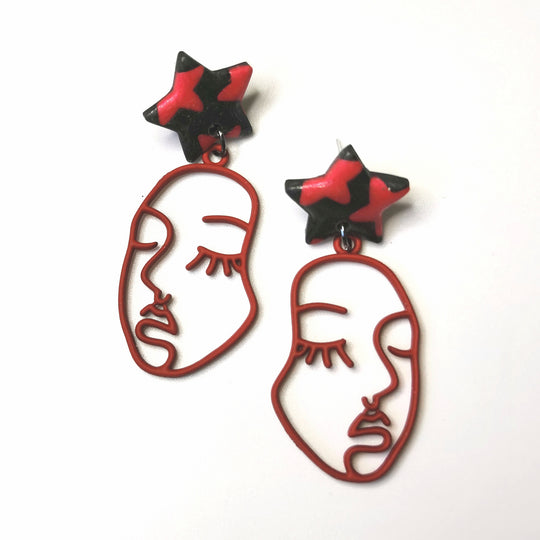 Sparkly Red & Gold Flake Heart Topped Face Drop Earrings, Polymer Clay Jewellery