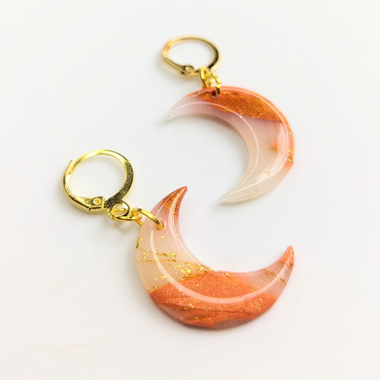 Marbled Orange & Translucent with Gold Leaf Moon Huggie Hoop Earrings