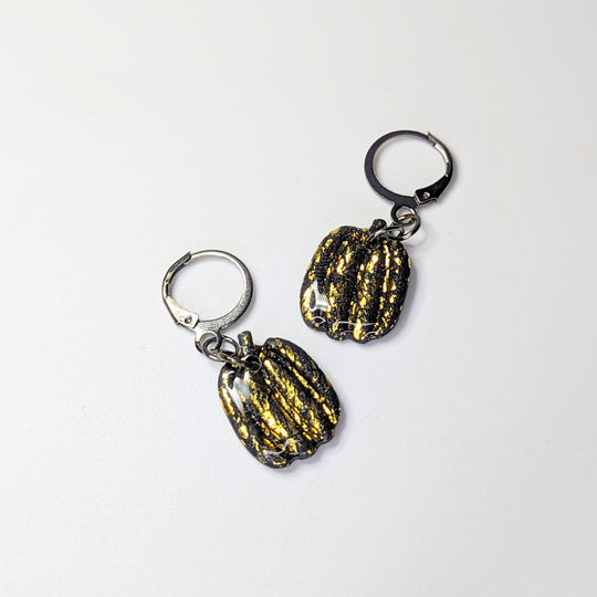 Sparkly Black & Gold Leaf Pumpkin Huggie Hoop Earrings