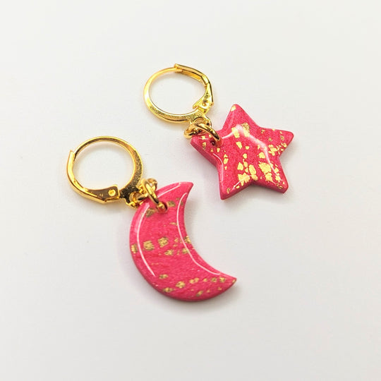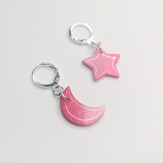 Sparkly Pinky Star & Moon Huggie Hoop Earrings, Polymer Clay Jewellery