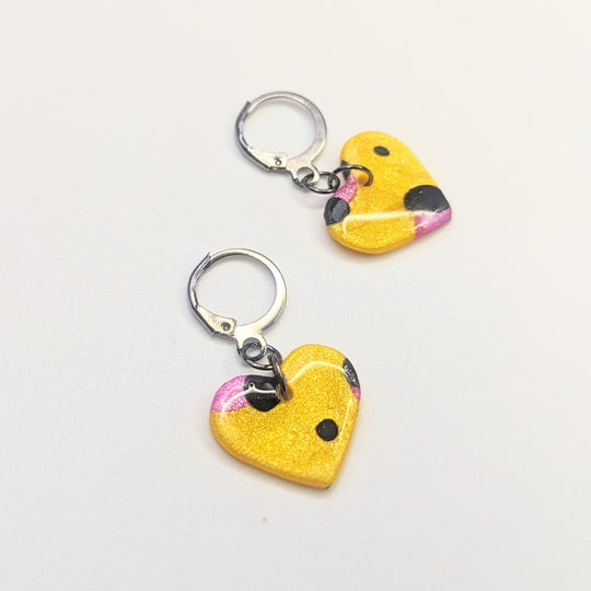 Sparkly Yellow & Pink Leopard Print Heart Huggie Hoop Earrings, Polymer Clay Jewellery