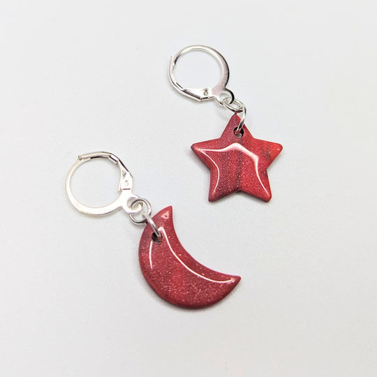 Sparkly Red & Gold Leaf Star & Moon Huggie Hoop Earrings, Polymer Clay Jewellery
