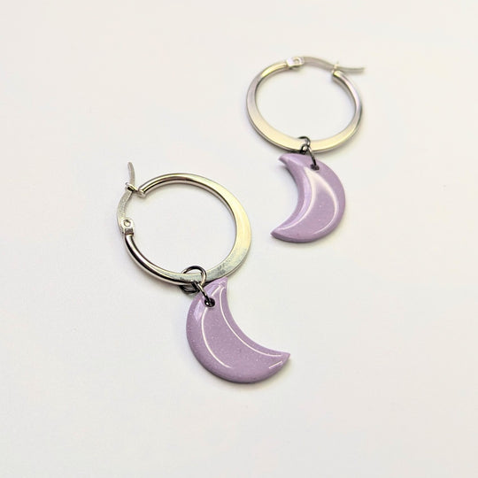 Sparkly Lilac Moon Hoop Earrings, Polymer Clay Jewellery