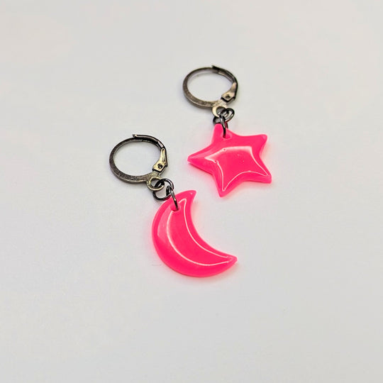 Marbled Neon Pink & Sparkly Purple Moon & Star Huggie Hoop Earrings