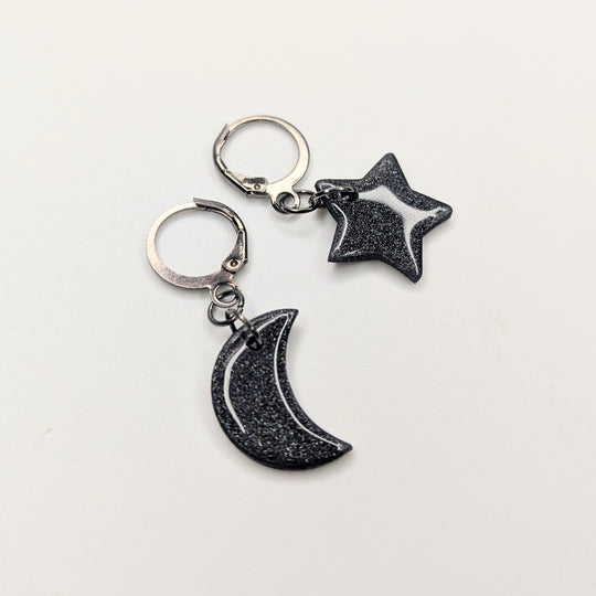 Sparkly Black Star & Moon Huggie Hoop Earrings