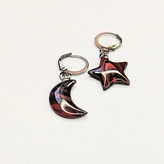 Marbled Black & Sparkly Red Star & Moon Huggie Hoop Earrings, Polymer Clay Jewellery