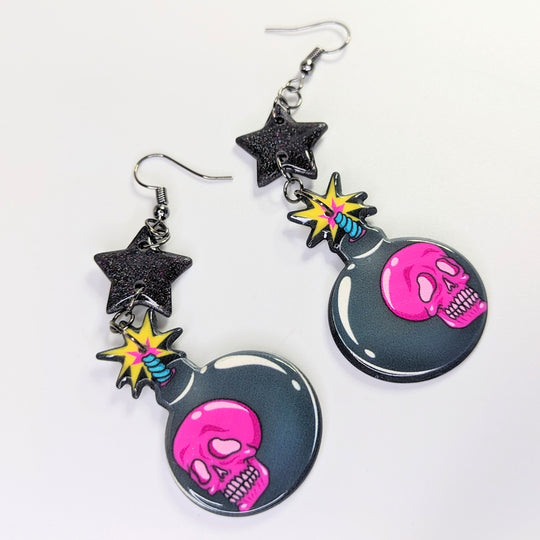 Sparkly Black Star Topped Skull Bomb Trapeze Earrings