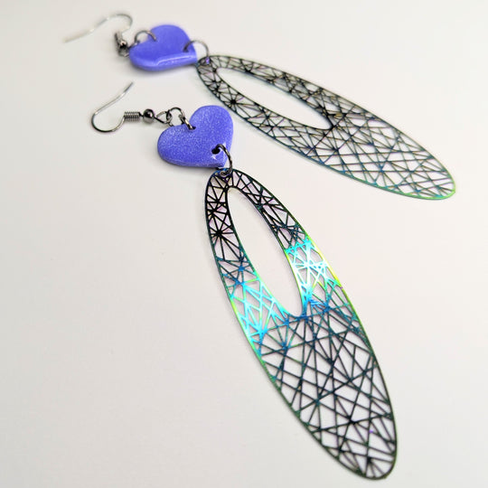 Sparkly Purple Heart Top Delicate Oval Filigree Trapeze Earrings