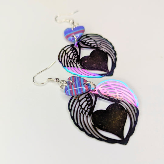 Sparkly Purple Striped Heart Top Filigree Winged Heart Trapeze Earrings