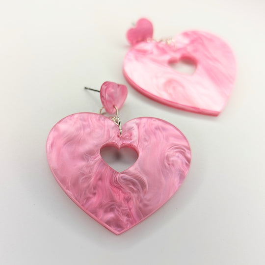Double Heart Marbled Pink Acrylic Trapeze Earrings