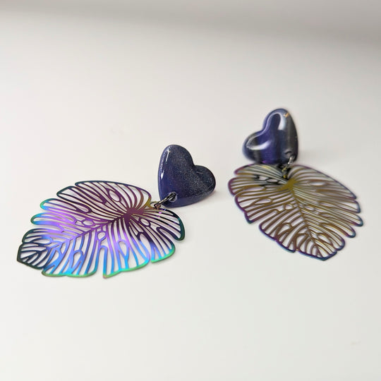 Sparkly Heart Topped Monstera Leaf Filigree Charm Trapeze Earrings