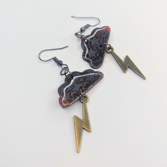 Punky Wine Red & Black Star Print Cloud & Lightning Bolt Charm Trapeze Earrings