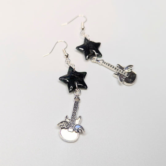 Sparkly Marbled Black & Green Star Topped Winged Guitar Charm Trapeze Earrings