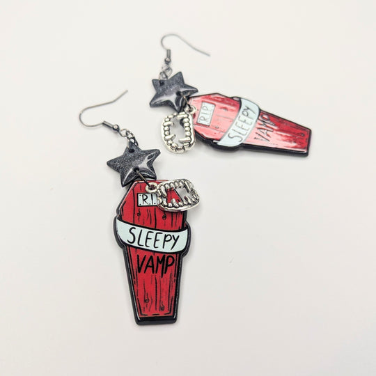 Sparkly Black Star Topped Coffin & Fangs Charm Trapeze Earrings