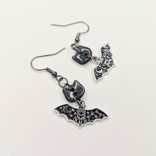 Sparkly Cute Black Cat Topped Bat Charm Trapeze Earrings