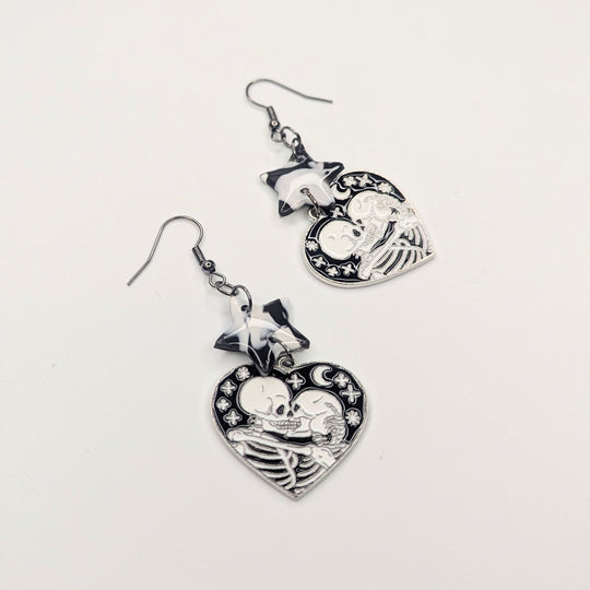 Marbled Black & White Star Topped Skeleton Lovers Charm Trapeze Earrings