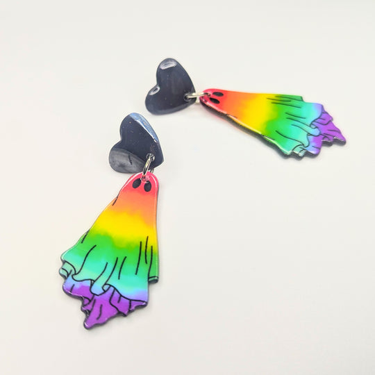 Dark, Sparkly Heart Topped Rainbow Ghost Charm Trapeze Earrings